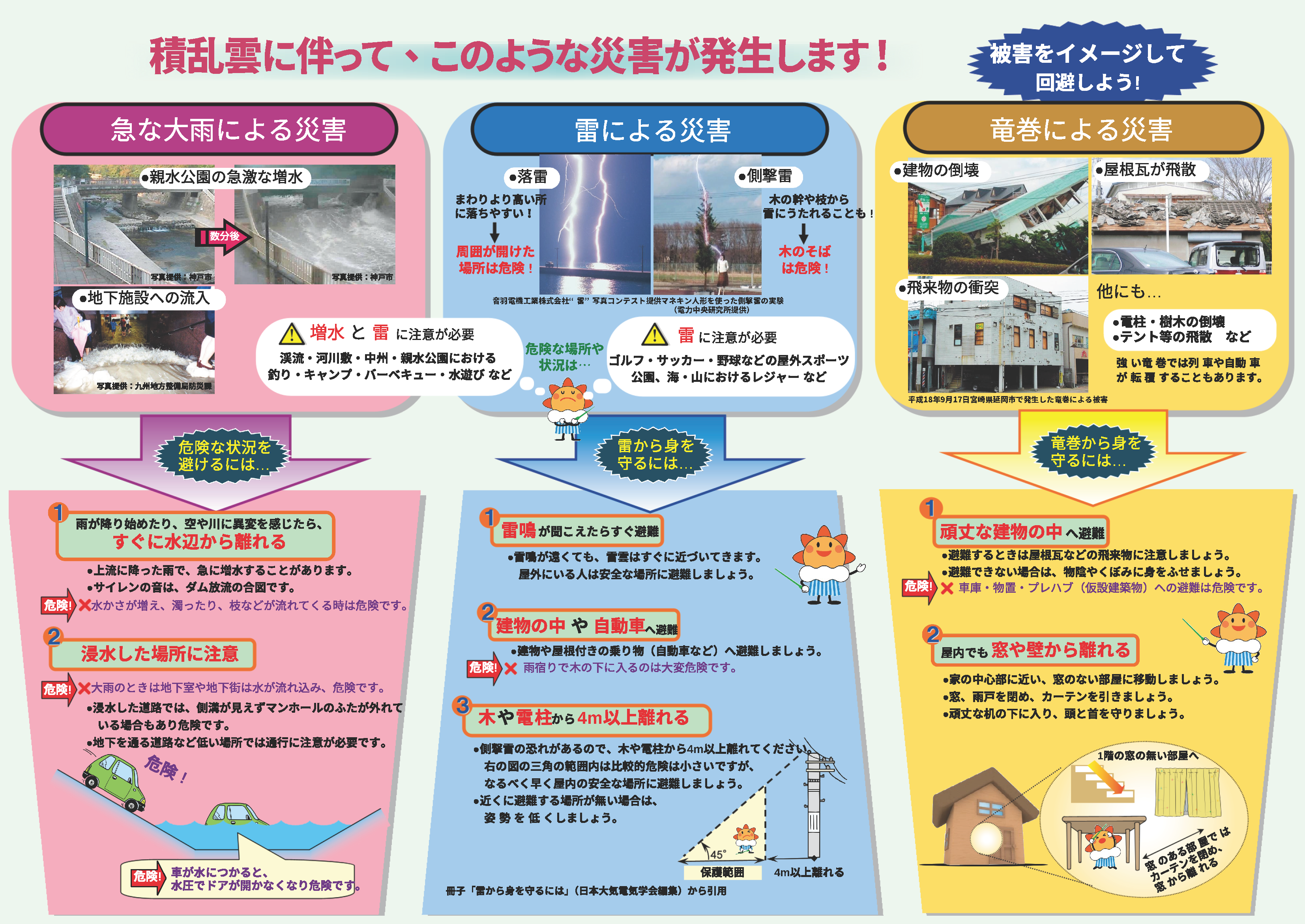積乱雲(入道雲)の下で急な大雨・雷・竜巻が発生し、大きな被害につながります。被害をイメージして回避できるよう、気象情報を有効に使って身を守ってください。